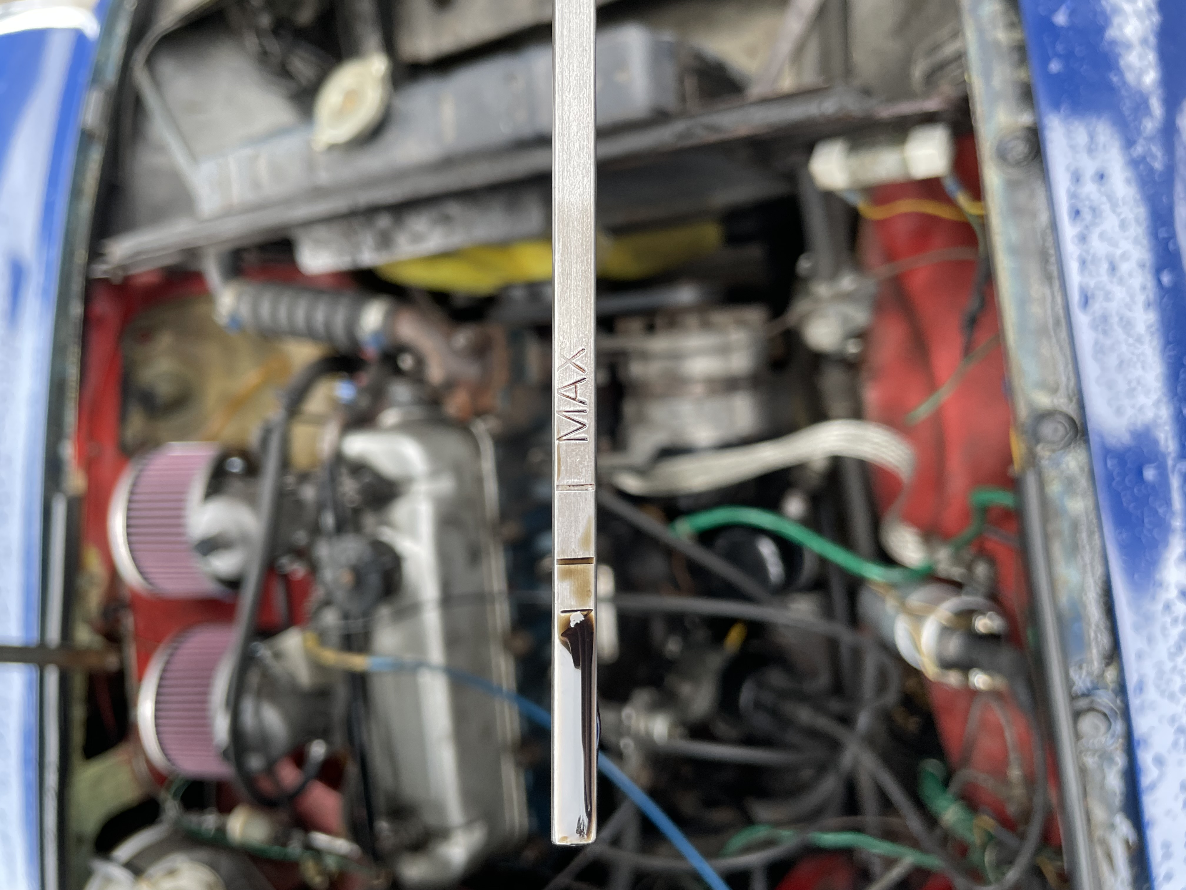 As with every previous post I've made, there's always a problem, and this one might not be a simple fix... Yesterday, I took the car for its longest ride yet, about 25 km. Before setting off, I checked the oil, which was right above the minimum mark. This should have raised an alarm because the last time I checked, it was right under the maximum mark. This morning, as I was planning to take the car for another drive, I wanted to ensure the engine had enough oil... but it didn't. Check the picture; the oil level is significantly below the minimum mark.