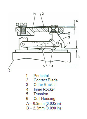 The original points were perfectly serviceable but I replaced them anyway and subsequently discovered the cause of the noise was that the factory-set points gap was far too small so as the diaphragm descended, instead of snapping sharply closed, the points just wandered closed and bounced around during the contact phase. This was the source of the odd scrunching noise I was hearing. There is a little tag on the end of the points plate which sets the gap (B in the diagram below) and after bending this up I got a decent snap shut of the points. The Burlen factory had left the gap at around 0.040. The pump operation is now much slower because the stroke is over twice as long which should equal longer life.
