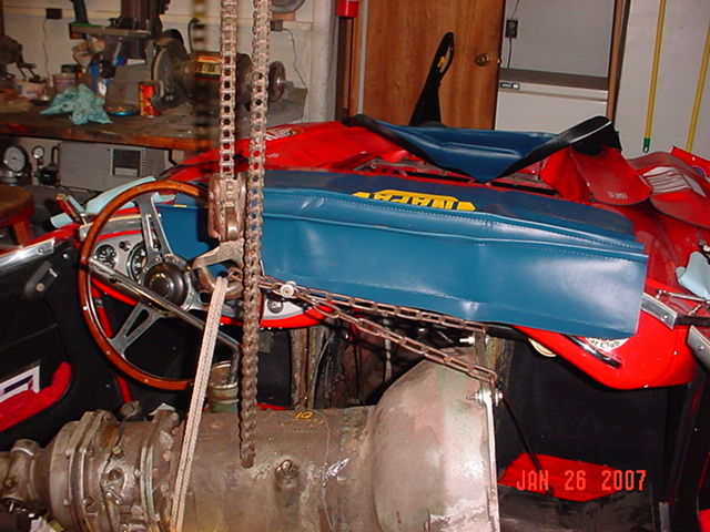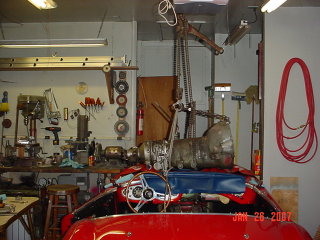 7- Raise it high enough to clear the car. In this case I couldn't lift it high enough to clear the windshield & didn't have enough room to roll the car forward, so I removed the windshield & rolled the car back & out from under the transmission. (8 1/2 ft. ceiling.)