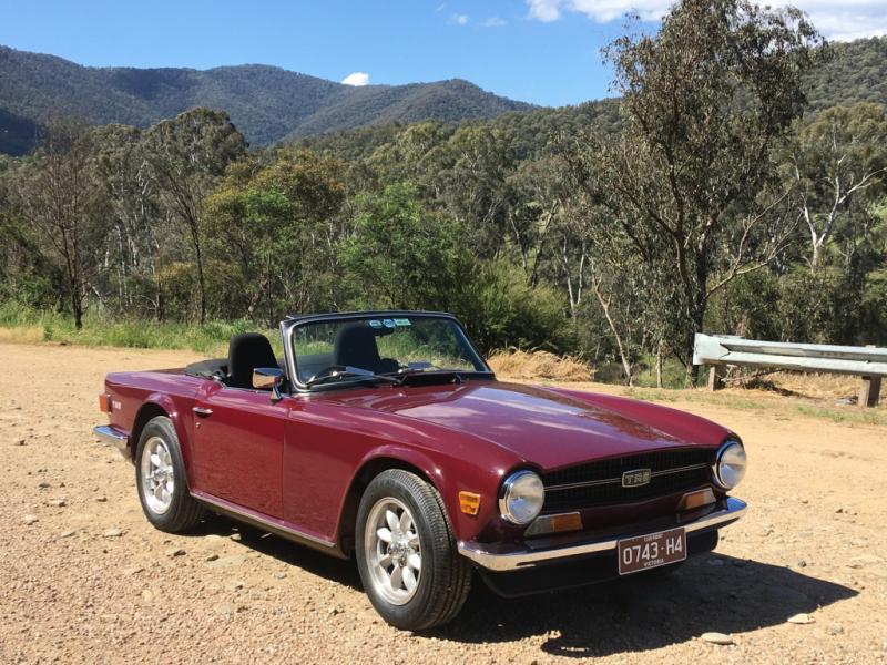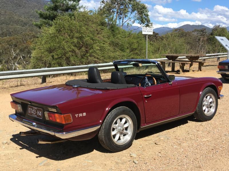 The TR6 is a 1970 model PI. Damson with black interior. Mazda seats are a recent addition.