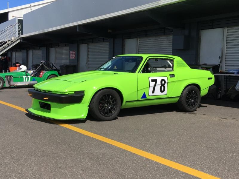 The TR7/V8 is obviously a racer. Rover 4.6 full race engine ahead of a Tremec T5. Big brake package up front and disc brakes on rear axle. Coil-overs all round. Just about everything is custom built, in fact there's not a lot that is stock left. Lots of "fun" on the track though.