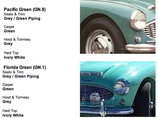 there used to be a site that allowed you to place the factory colors on the exterior and interior of big Healeys, which was great fun, although the colors were an approximation. I think the sie is till out there, but it is harder to find these days.