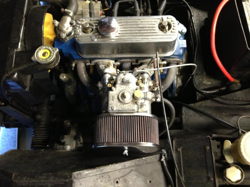Engine fired right up. Throttle response is instantaneous compared to the SU carbs. I think it was hard on the belt because now I've got a shreaker that needs to be replaced. Tightening it didn't mKe much difference. It cut my carb tuning session short.