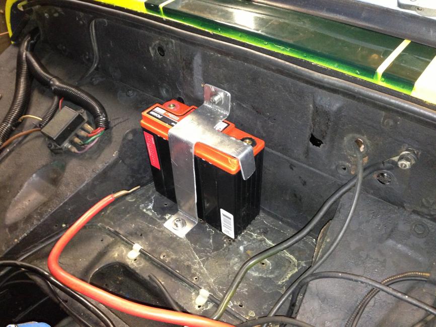 Went from a 50lb. Diehard to a 15lb. Odyssey. Had to make a tie-down bracket. Still need to clean up the wiring.