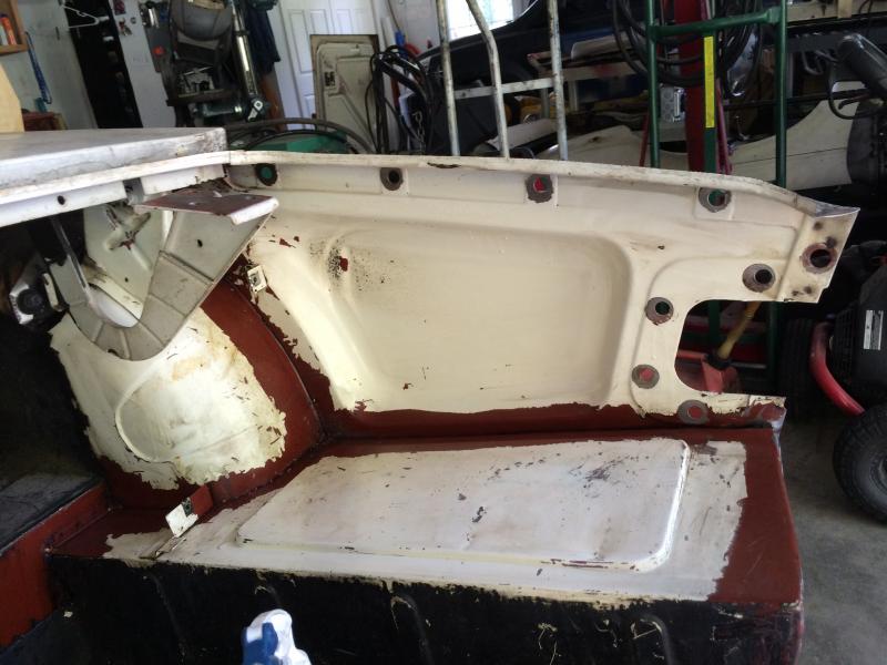 There is a lot of red on the inside of the trunk and behind the seats and in the corners of the floor pans. I don't know if the original color was white and then it was painted red at some point in time before it was sanded. Maybe it was originally red and painted white. The red seems to be under the white.