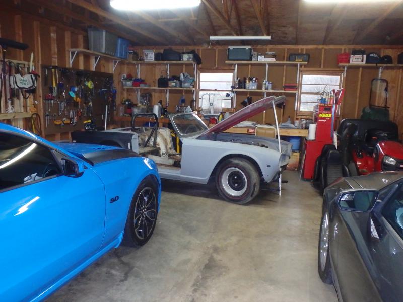 Welcome to the forum David, you might want to invest in some of those cheap wheel dollies from Harbor Freight. You could turn the TR6 90 degrees giving you more work room all the way around. Nice Mustang!
