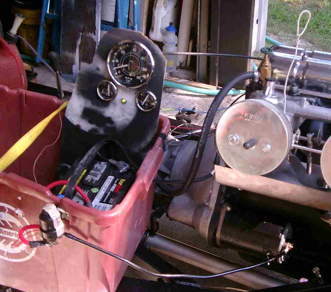 It can be simplified for your test. If you look at my picture, you'll see a gas can sitting on the frame, with a gas hose running out of it that is attached to the fuel pump. (I also included a hand in-line primer pump since my fuel pump does not have a primer handle.) You can see my 'battery box' (an old recycle container) has a switch mounted to the front. It turns on/off power to the wire that connects to the coil (there is also a wire from the other side of the coil to the points). (I also added an electric temperature gauge with a voltage stabilizer and an ignition light, but those are optional.) The battery ground is connected to a transmission stud, and the positive side is connected to the solenoid. The other large stud of the solenoid is wired to the starter. All I need to do is press the solenoid to turn over the engine, and if the switch is "on", it will run -assuming everything else is in order.