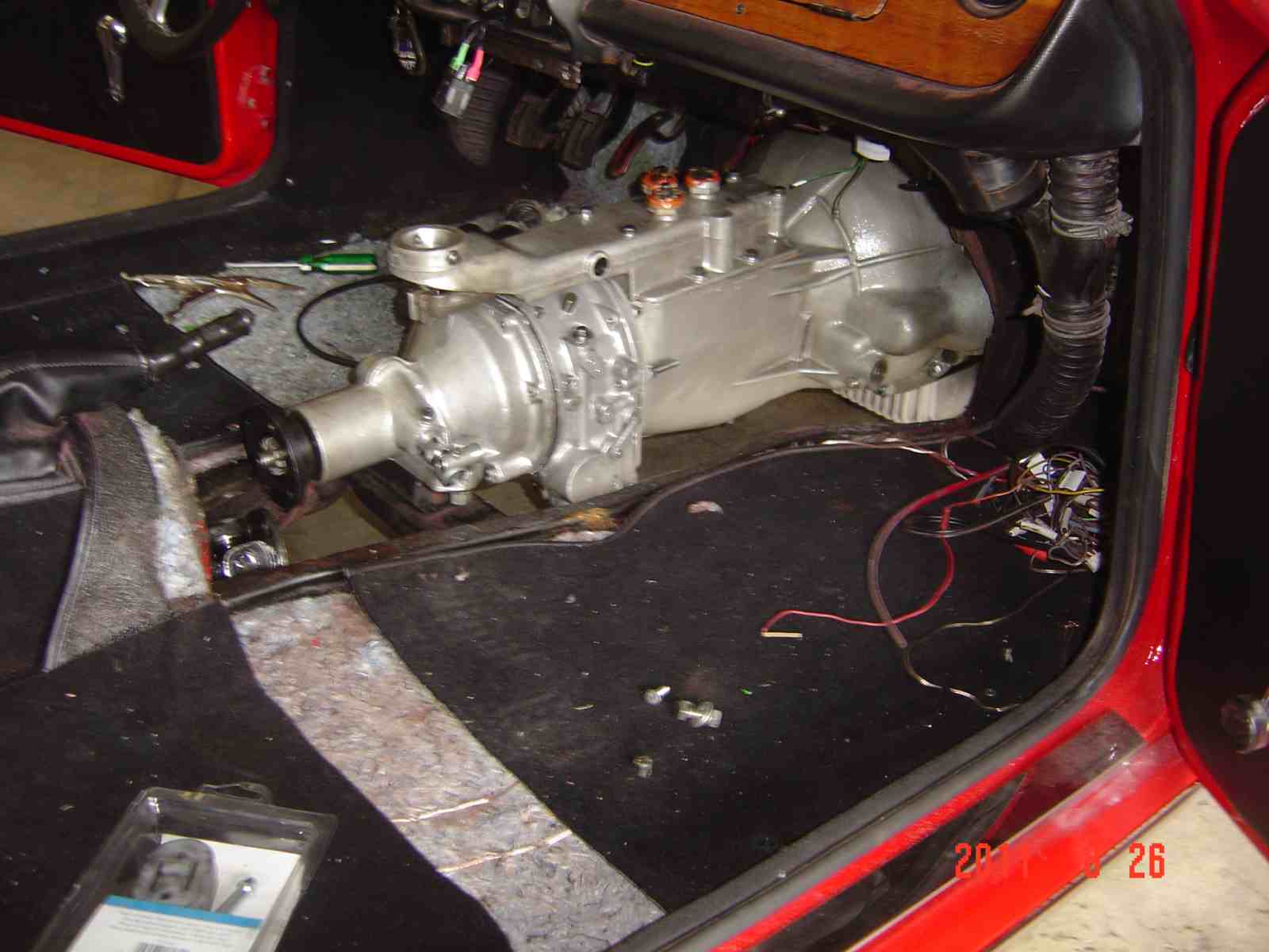 got the transmission and engine bolted together, no big deal. put the engine and transmission in back in the car, and yes I have pics but cant resize them since I now have windows 7, but thats another issue, my fork lift died so had to buy an engine hoist. now guess what the front bumper had to come off, well dropped the engine in and bolted the mounts up now all is good,(I think they built a car around the engine) and now the tedious stuff begins. Wired up the OD switches, seems at first the OD worked but then I checked and it worked in gear and in Neutral in first and reverses, so checked the wires, and got that straightened out, hooked up the alternator, now I have the ford Fiesta alternator and seem I have a small gauge brown wire that I cannot figure where it goes. Next, I purchased a now poly transmission cover, and of course the holes dont line up so I have to enlarge them, and its seems to be about 1/8 to 1/4 inch too long. so got to tweek it, and now the big issue, since I now have an OD the angled spedo mechanism hits the transmission tunnel, After market parts suck, seems I am always making them work, so I am thinking I will get my propane torch, gradually heat up the area where the angle drive hits, soften it up and streach it to make that area bigger.