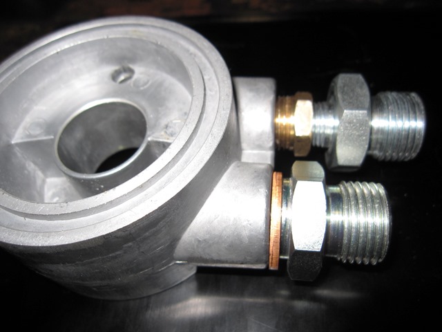 I'm trying to install a thermostatic oil filter sandwich to use with an oil cooler on a 1275. The sandwich has two female 3/8" NPT ports, but my hoses have 1/2" BSPT fittings. Victoria British sells some adapters designed to connect these BSPT hoses to the engine by removing the oil pipe that runs between the oil filter head and the rear of the block. The threads at the filter head are 1/4" NPT and those at the rear of the block are 5/8" UNF.
