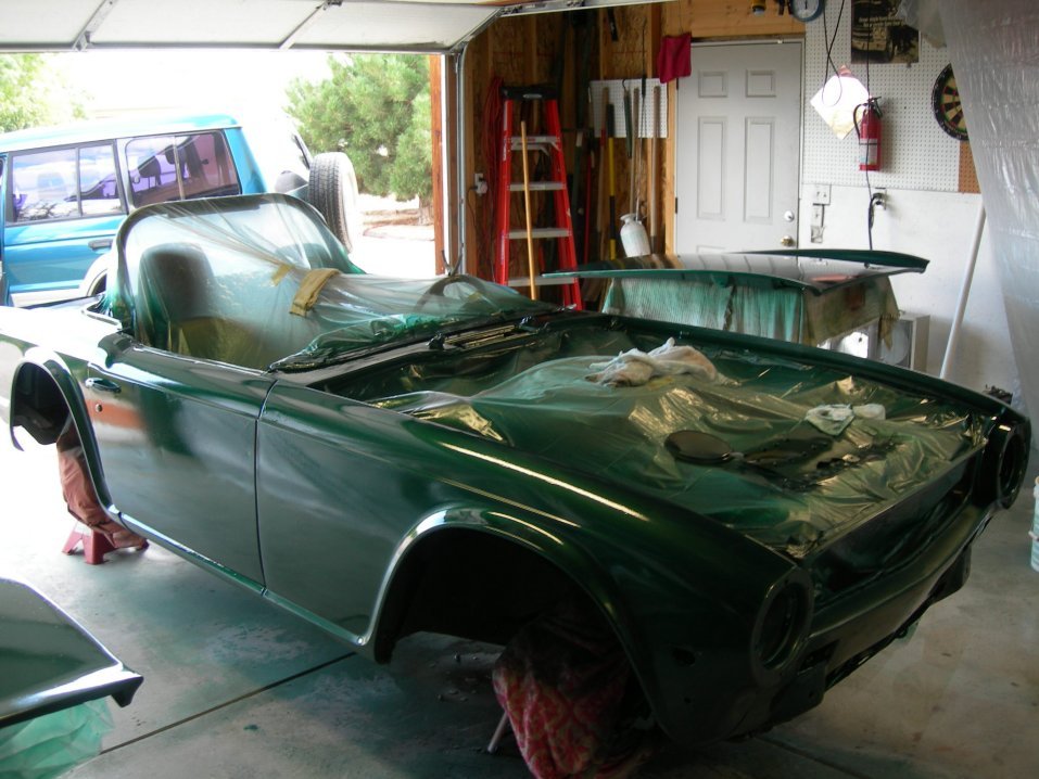 Alright, the budget is not going to allow for a full blown $3-4000 paint job and the discount place won't touch it because it is torn all apart. So as the saying go if you want something done right do it yourself. When I was at the Colorado Concourse talking to Lee Janssen, I found out he painted his turbo TR6 in his driveway. If you check out the pictures on his site. It looks really good, no orange peel, dust marks etc.