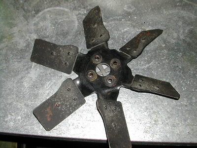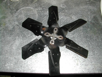 Below is a front & rear view of the fan I removed, it did have locktabs on the bolts, but the bolts went thru little rubber grommets with steel sleeves (seen in rear view) & it was wobbling on the worn rubber making a nice clunking noise at low idle, strange fan... 3 of the blades had angled reliefs, 3 didn't ... anyone recognize this fan ? wonder what it's off of ?