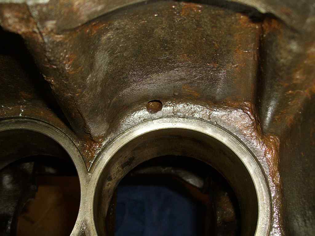 However, the cavity behind the hole isn't all that deep. If you have penetrated 3/8" or so below the surface of the block, then you are probably up against the outside of the #4 cylinder liner and need to start working to the top or sides.