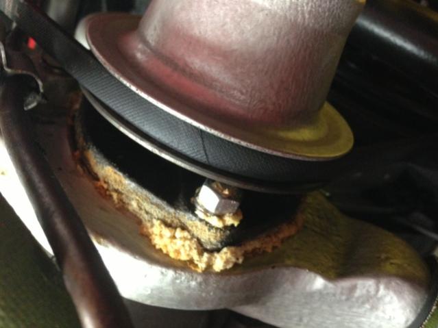 I'm only guessing here. It may be just a water leak, but the powder looked a lot like what you see when galvanic corrosion occurs. Generally, it is caused from contact by dissimilar metals when low current is allowed to flow through them (a circuit has to be created, and the two metals create the "battery"). You see it in waterborne objects where the water allows an electric circuit to be completed. Since this is steel on steel, maybe there's a copper, aluminum or lead gasket between them. Good luck.