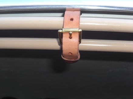 With the top removed and the frame collapsed and stored backward in the tubular brackets, it could rattle. AH supplied the BE with a small leather belt strap that wraps and tightens around the frame center when the top is removed to keep the frame from moving around.