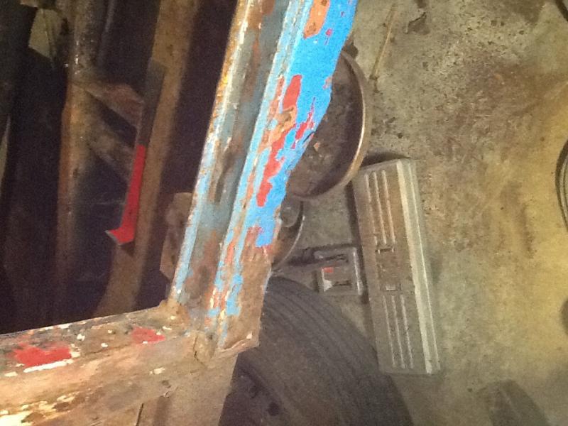 So I started to drill out the spot welds in the door opening, have most of them off now just a couple at the back edge I'm fighting with, but they will be off soon I hope, and I was looking around for some easy welding to do when I noticed that the front body mount is cracked and almost rusted thru, and the little bit I can see of the rear one it's looking the same. The "A" post is good except for the last couple of inches at the floor level, the fire wall where it angles down to the floor is the same, last couple of inches seem to be rotten. The rocker panel is rotten and pulling away from the inner sill at the bitter edge of it's so I'll be ordering a set if those as well, or patching them if I can. The inner sill looks good, just surface rust or so it seems won't know until I start cleaning up getting ready for paint and welding.