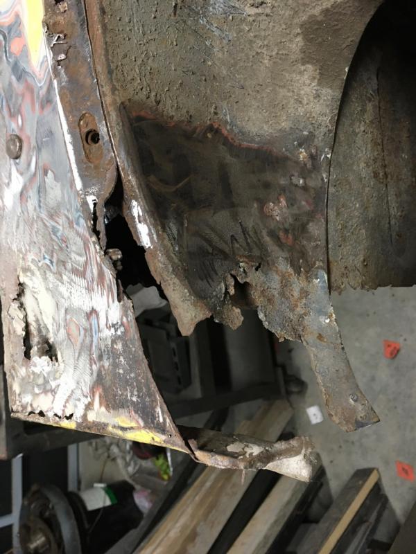The passenger side is next and it is the ugly side but now I have the driver side to go by. The entire lower corner is gone so I have some metal forming to look forward to. I have the pattern to make the rear closing panel and will get it made and out of the way but it will be a while before it will be installed after sandblasting, cage nuts, and repairs to the passenger side. Frank