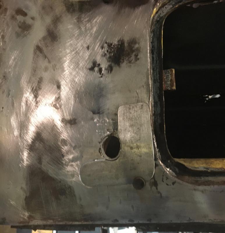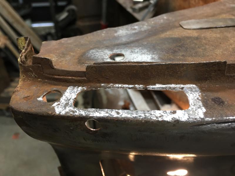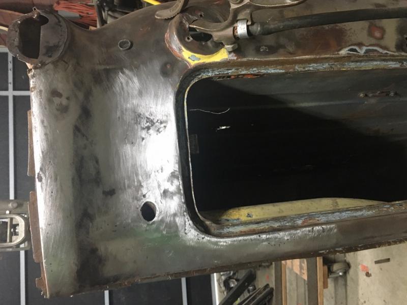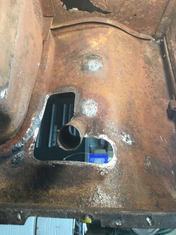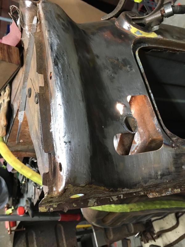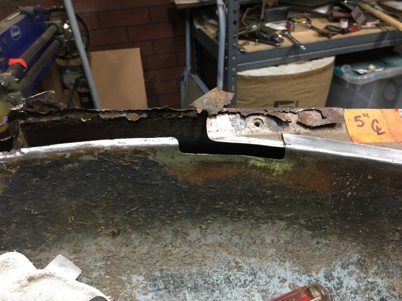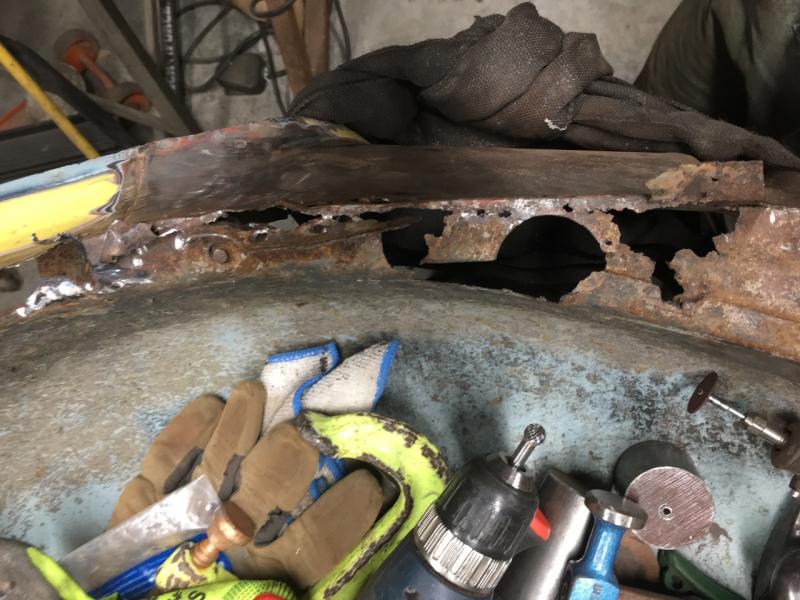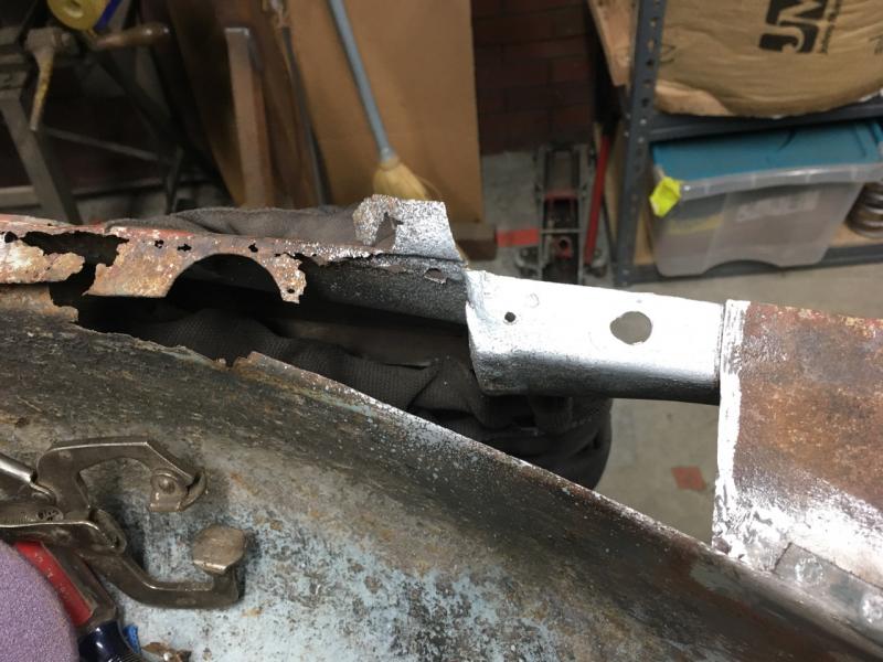 Ever wonder what the inside looks like? I took this picture to emphasize that both sides need to be clean before you weld. I will be figuring out how I am going to sand blast the inside and prime before I replace the new rear closing panel. Input on this subject is appreciated, sand blast media ,POR 15, Epoxy primer, rattle can primer, rust converter?