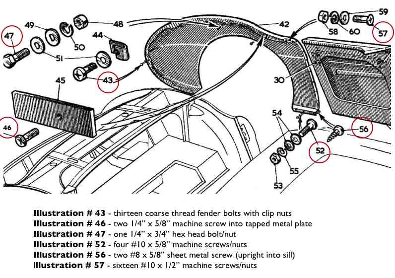 Note that for the part illustrated as #43 the list calls for 13 pieces and for part #47 it calls for 1 piece. Since these are odd numbers and there are two wings the implication is that one wing uses 7 of the #43 fasteners and the other wing uses 6 of the #43 fasteners and 1 of the #47 fasteners.