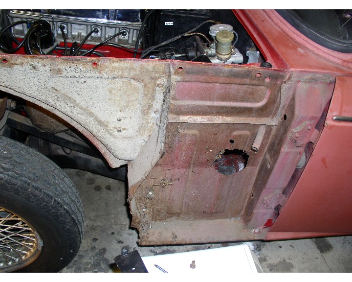 7. While things are apart, its an opportunity if you wish to drill some 1/2" access holes along the inner rocker (inside the cockpit) and spray in some sort of rust protector like Waxoyl, thoroughly covering the inside of the rocker and its seams as best possible. The access holes can then be plugged up. There are kits to do this sort of rust prevention, available from various sources, complete with a sprayer to hook up to a compressor, the rust preventative materials and plastic plugs to close up the holes when done.