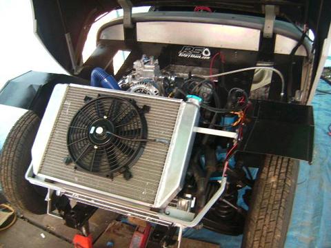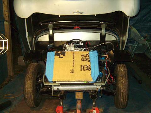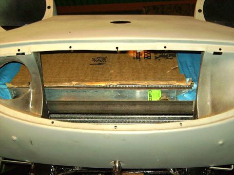 Ok here's the rad with the hood on, it was as difficult as I thought but she in there with room to spare! Here the Rad, covered for protection from weld spatter with the hood up!
