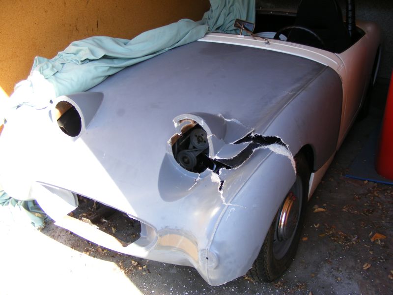 The final blow happened about seven years ago when someone lost control of their car and crashed into the garage door, hitting the Sprite in the left front corner and pushing it into the back wall of the garage. After inspecting the damage and taking a few pictures, John shut the door and never visited his car again. The car has good "bones" but now basically needs everything redone.
