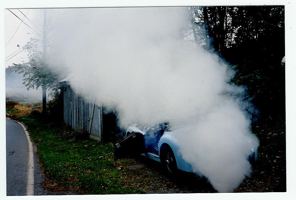 Gang, my TR3 is emitting large amounts of smoke out the exhaust (see attached photo). Is this normal or cause for alarm? The smoke has a wonderful aroma of roasting walnuts.