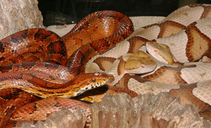 The unfortunate thing for Corn Snakes is that they are easily mistaken for Copperheads. It would be very hard to tell young grandchildren how to distinguish one from the other. Another unfortunate thing is that Copperheads often lurk in dimly lit areas covered with bushes or pine straw where their camouflage conceals them. Rather than withdrawing and revealing themselves, Copperheads will stay still until you (the unaware victim) startle them into biting. I've had three friends bitten by Copperheads while they were doing routine yard maintenance. Those things are just too secretive for their own good!