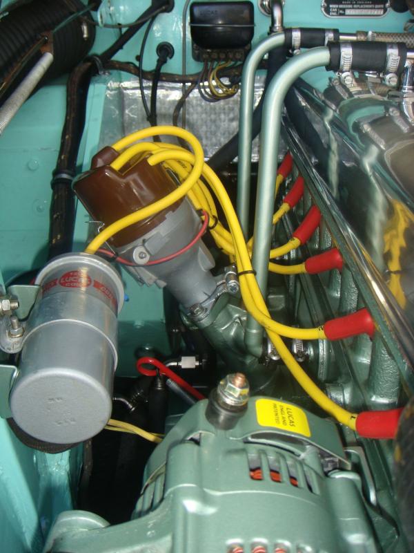 I'm using a Pertronix ignitor, Pertronix top entry brass distributor cap, (Moss) premium Ignition rotor (red), Lucas Sports coil and Champion RN12YC spark plugs.