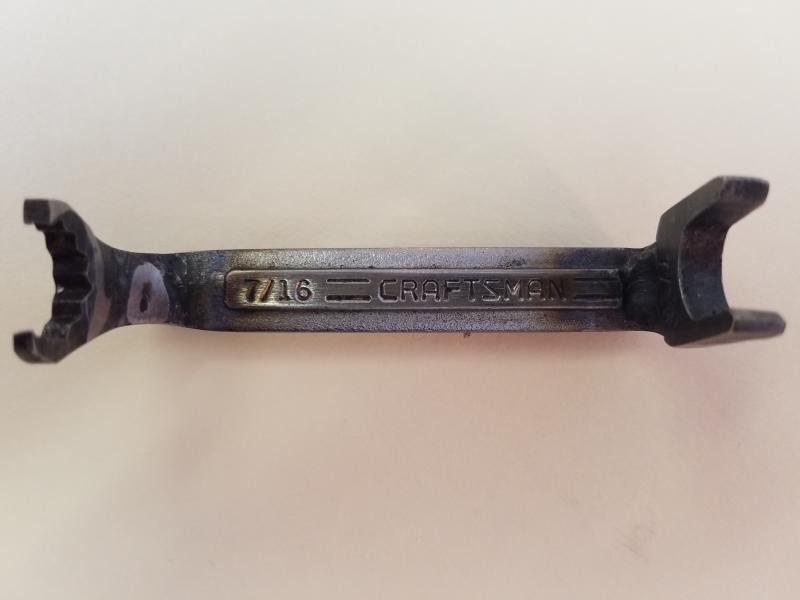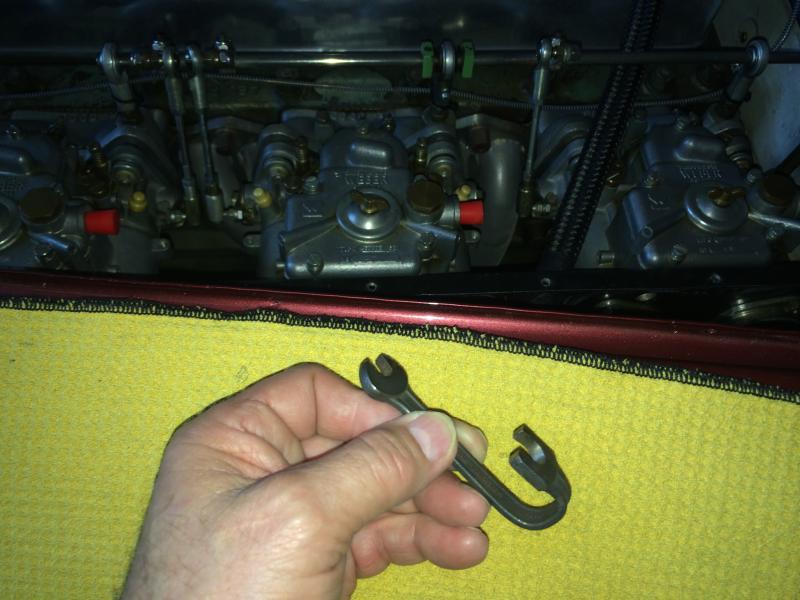 I am attaching a pic of the "Special Wrench" made from a standard Craftsman 7/16" combination wrench used to tighten the "Float Chamber Fixing Bolt" on the front SU HS6 carburettor on my Elva Courier. While this bolt is easily accessed when the carbs are off the car and on a bench the bolt only seems to loosen up on race weekends, and getting my hands in between the carbs is difficult when they are mounted up to the engine. Access to the bolt head is made almost impossible because it is shrouded by the rigid line running from the bottom of the bowl to the carb body.