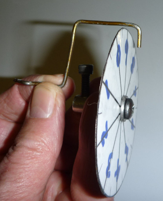 The center hub is a piece of aluminum rod long enough to accommodate the square end of the cable and the screw holding the disc on. Half is tapped for that screw. A hole is drilled at right angles for the allen setscrew that holds the hub to the cable end. The disc is a piece of aluminum flashing. The circle is art downloaded from wiki images - circle divided into 10ths - glued to disc with spray adhesive. Number the gradations 0 - 9 counter-clockwise (disc rotates clockwise). The pointer is made from coat hanger wire.