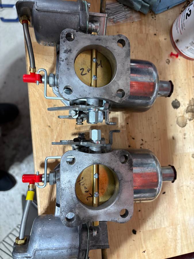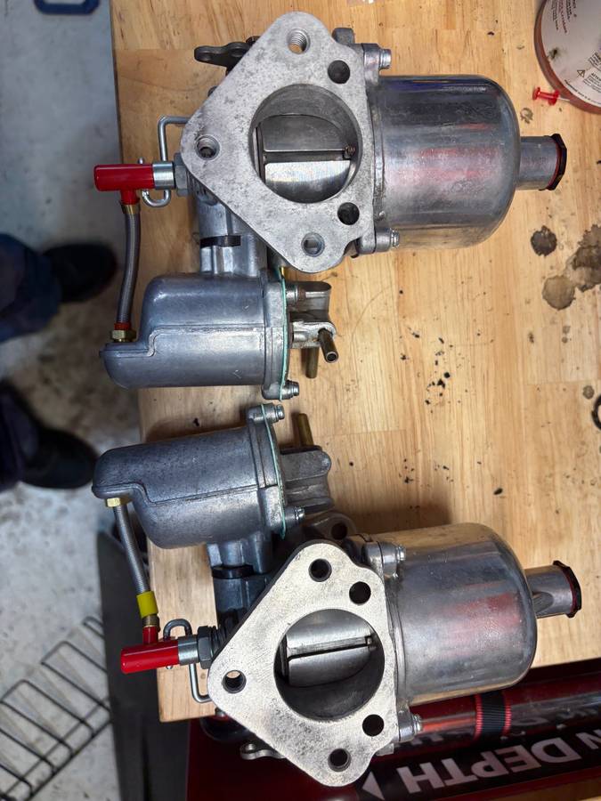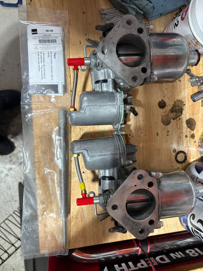 Originally Volvo carbs but rebuilt for a Triumph TR6, would work on other makes but would likely require a needle/spring change. SU HS6 1 3/4 inch. New throttle shafts, butterfly’s, jets, float bowl floats, valves, gaskets and screws. New needles to support a stock TR6 engine. Parts and needle pick from Joe Curto at British Superior. No play in shafts. Also included is a jet centering tool. Includes throttle linkage and parts to make the choke linkage. $600, bolts directly to stock manifold.