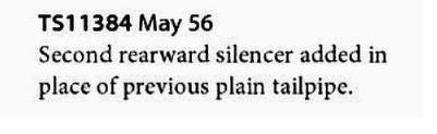 I agree with Andy, but I believe that change point is wrong. The "resonator" (which is really just a shorter version of the main muffler) originally became standard at TS11384. There was a change at TS15706, but according to Bill Piggott, it was just a modification of the second silencer to further reduce noise. Seems like I remember reading that it just got longer at the later change point (something like 15" instead of 12"), but I can't find a reference for that offhand so I could be mistaken.
