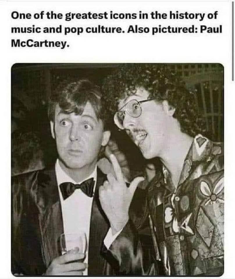 There's a story that Weird Al went to a party fairly early in his career and was feeling very intimidated by all the famous people around him. Then he heard a familiar voice call out, "Oh my God, Weird Al is here!" The excited Weird Al fan turned out to be the other guy in this photo.I know there are a few Beatles fans among us - including meโฆ please donโt kill me!!