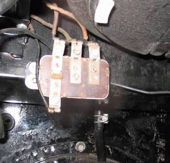 My new battery box came from England in 1988 and I later found out that the two angles where the dashboard supports are screwed to the back of the battery box were too low or else the repro battery box was about a 1/4" to 3/8" too shallow. Anyway, once it was all together, I had clearance problems where the body for the choke cable was too close and rubbing the bottom of the heater body over near the glove box. Also I had to make an adaptor plate to hold the relay lower because there wasn't enough space for the relay to fit onto these two new flat-head screws I had welded in from the other side. I tried but it wouldn't fit up behind the back corner of the heater. See the adaptor plate which lowered the relay body about 1/2".