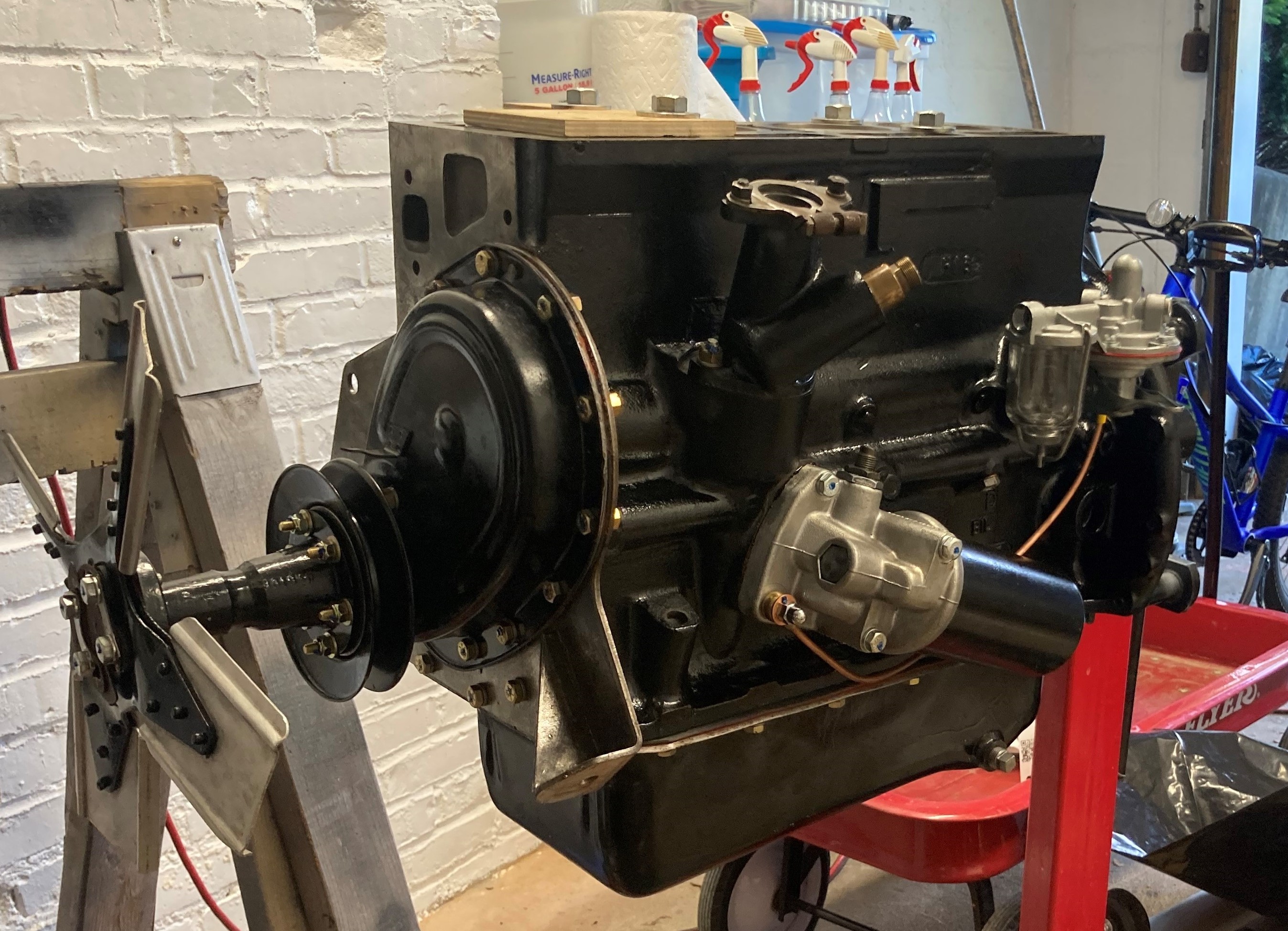 Next step is to take the engine off the stand. I built a rolling cart out of 2x4s that fits around the oil pan.