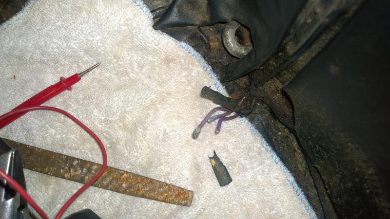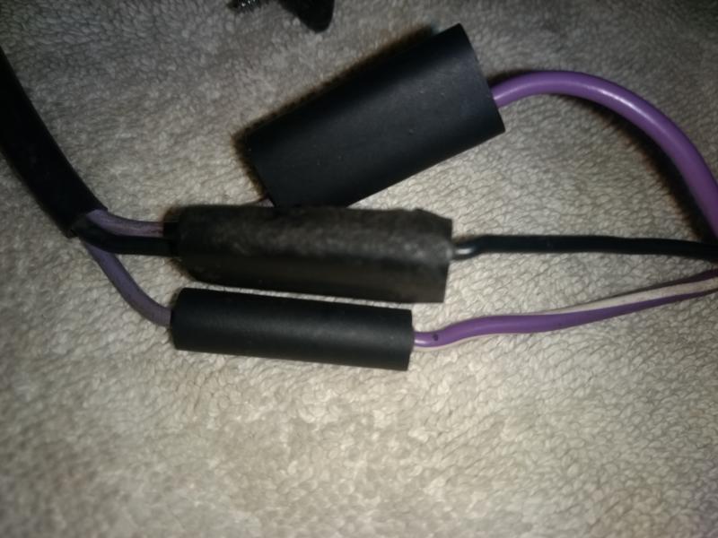 The 3 purples were in the same type of black thing. I opened it up figuring the 3 purples would be together. They weren't one had a lug pressed on the end, the others were snipped off, you can see the green corrosion on the tips. Found one purple was for the boot lamp, one for the tunnel lamp and one hot. So soldered them together, put some heat shrink on and fixed.