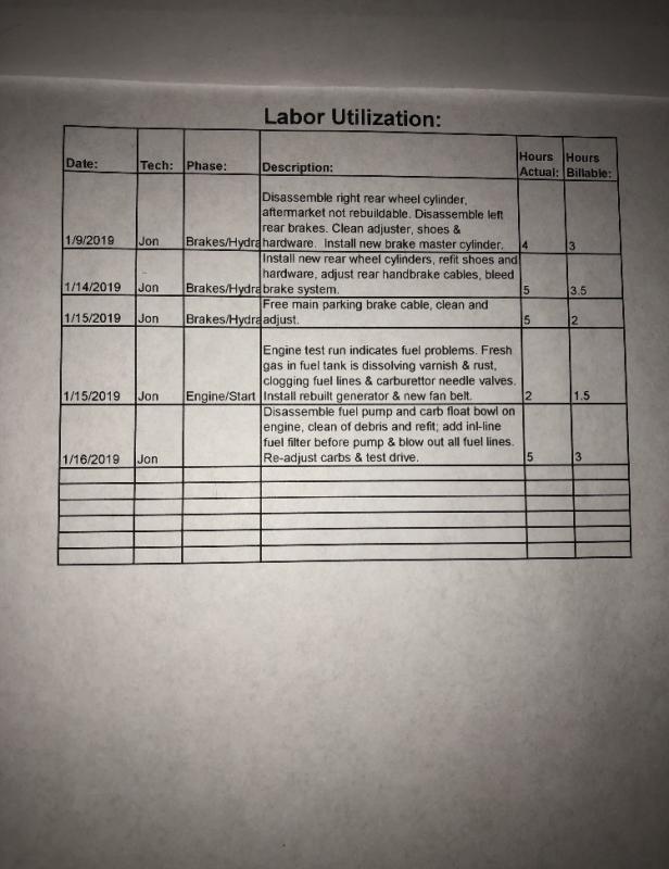 Based on the attachments above, and thinking strictly in terms of the bottom of page 2/top of page 3 where the labor hours add up to 13, there was more done for those 13 hours than merely replace two wheel cylinders and flush the hydraulics. Granted some of the other work listed would have to be performed in order to replace those two wheel cylinders but replacing a master cylinder and fiddling with hydraulic hard lines would be outside the scope of replacing the two rear wheel cylinders. Does it justify 13 hours? That's hard to say without a better understanding of the extent of work performed for those hard lines and how the work flowed from day to day since the tasks listed covered multiple days.