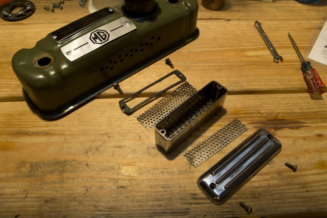 I was hoping someone could shed some light on a unique valve cover vent on my 948. The PO drilled a good number of holes in the side of the valve cover and attached this chrome vent. In all honesty, it doesn't look half bad when you open the hood. And it provides a pathway the size of a highway for the valve cover to vent. But it doesn't seal well and allows oil to splash through the holes and drip down the engine. Is it missing a foam element or something else that could help prevent the oil leak?