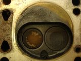 This is a typical head with worn out seats. Normally the exhaust valve, on the left, would be sitting even higher than the intake is sitting. It has eroded a pocket down into the seat, with a space around the head about the same as the worn out valve guide clearance...or several thousandths larger than the actual head.