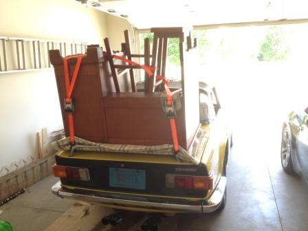 Went to Milwaukee Saturday to see our son. He is in grad school at Marquette and needed a desk, a couple of bar stools,... British Car Field Day was Sunday and it's a good show so, we brought the TR down. The trunk was full and we had lawn chairs in behind the seats. In college I had an apartment size refrigerator on it. Ran like a champ, 70 the whole way. Not the best gas mileage, but, it did the job. Told my wife as long as the rear decklid stayed on, we were good.