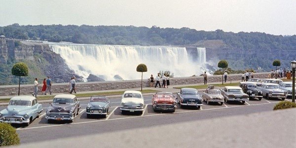 Picture is circa 1958 at Niagra Falls. What are the 3rd car from left and 5th from right?