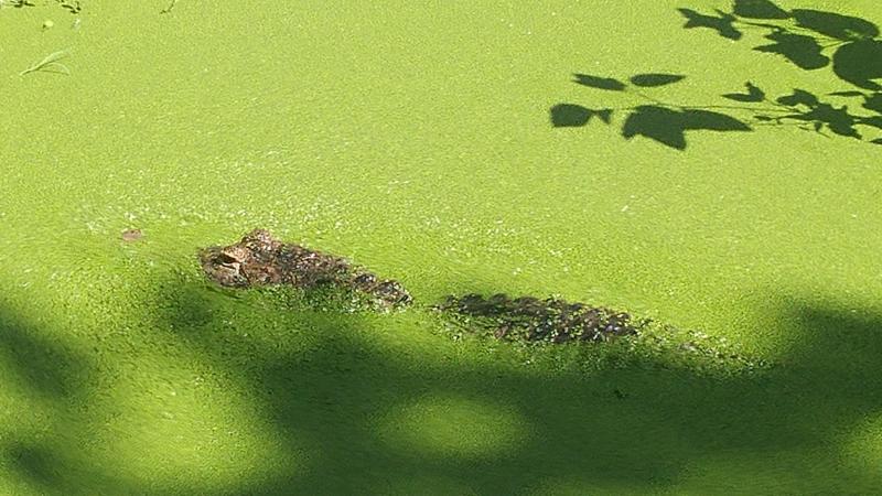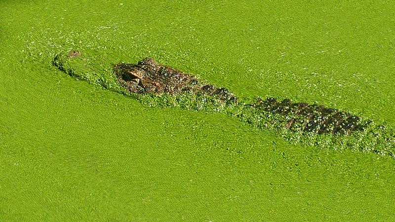 I can't really tell from the photos; could be algae or duckweed or something else. But it's some sort of plant. Lots of swamps have areas covered in it. Part of the food chain, but also provides cover for the alligator.