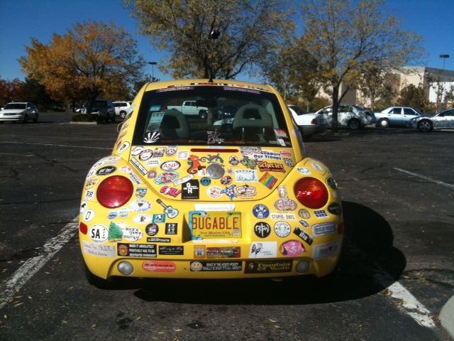 Saw this in a mall parking lot while walking to lunch. There were about as many stickers on the sides and front too.