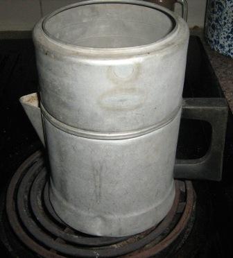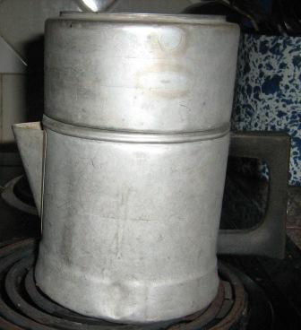 My favorite way to cook it...an old aluminum drip pot I got from my grandmother over the campfire...mmmmmmmm
